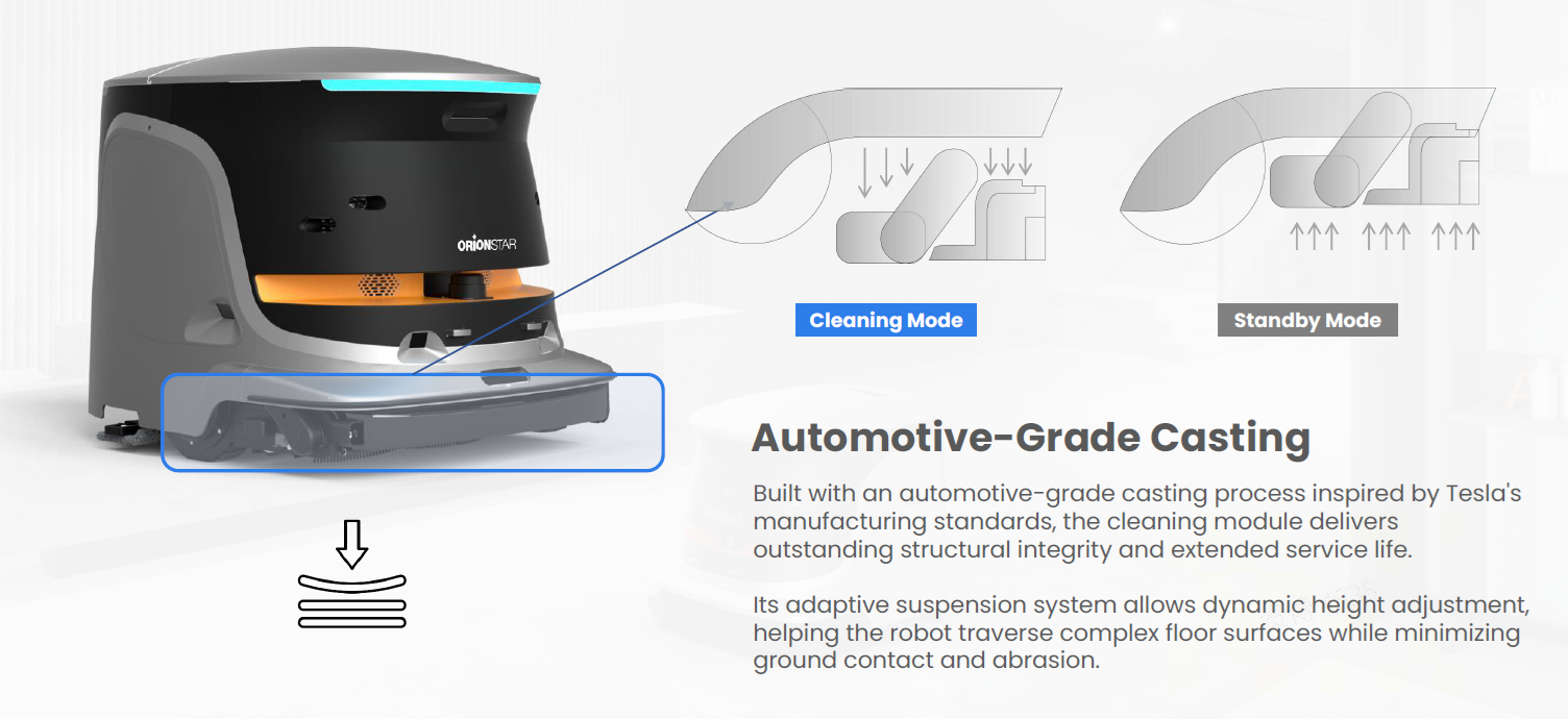 OrionStar CleaniBot được thiết kế theo tiêu chuẩn đúc khung gầm ô tô, đảm bảo độ bền và ổn định vượt trội trong mọi môi trường vận hành. Hệ thống treo thông minh tự điều chỉnh độ cao giúp robot di chuyển linh hoạt trên nhiều loại sàn, hạn chế ma sát và tăng tuổi thọ thiết bị — giải pháp tối ưu cho vận hành bền bỉ, chuyên nghiệp và an toàn.