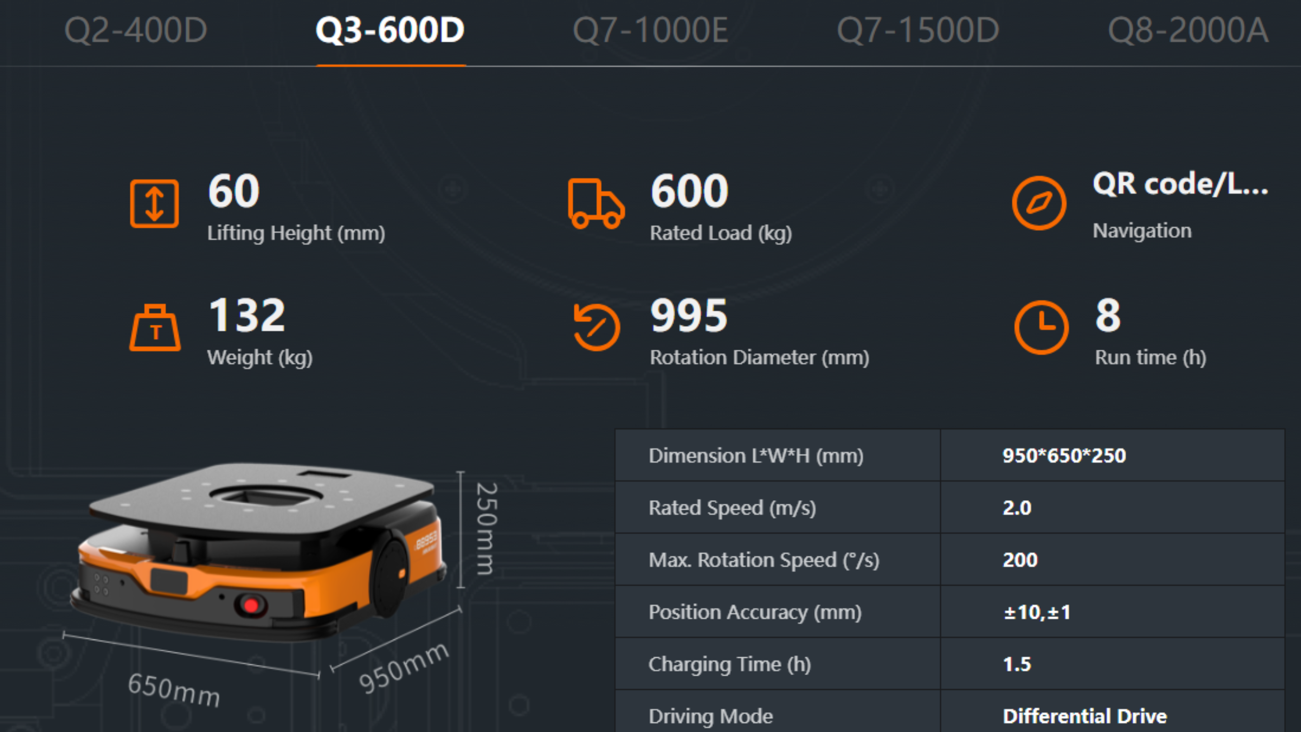 Q3B-600D được thiết kế như một nền tảng robot di động, cho phép tích hợp nhiều cấu trúc phía trên như: